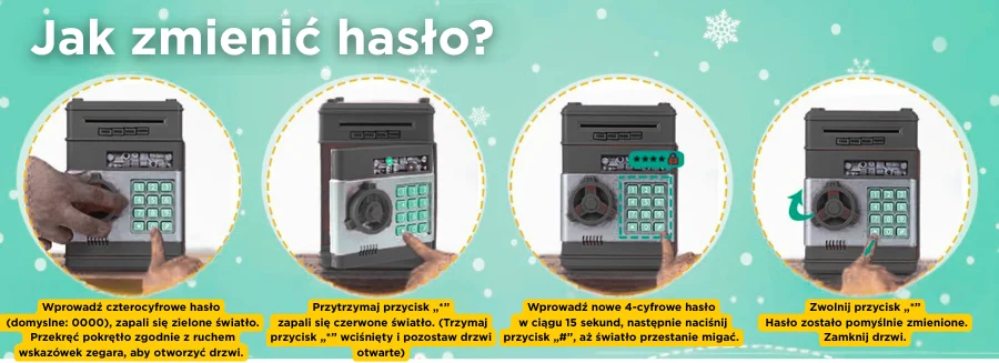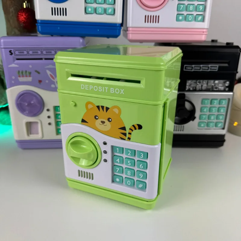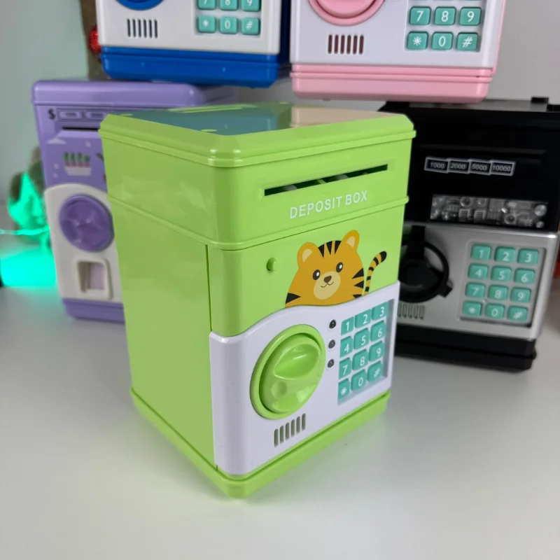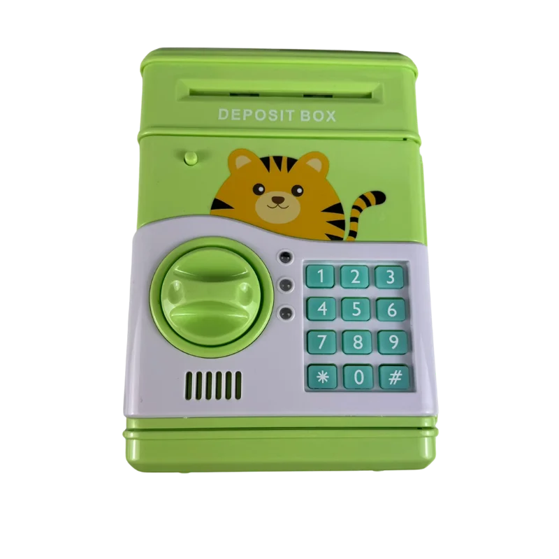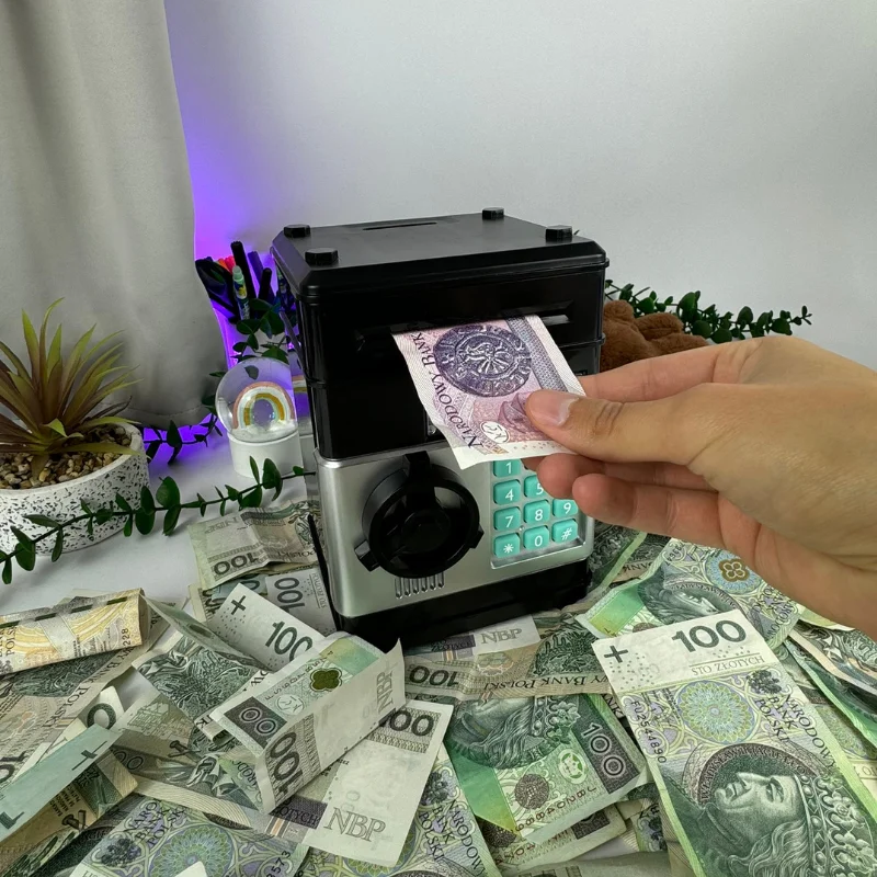 - Skarbonka z kodem PIN i efektami świetlnymi i dźwiękowymi, idealna do nauki zarządzania pieniędzmi. (kod PIN można ustawić własny)